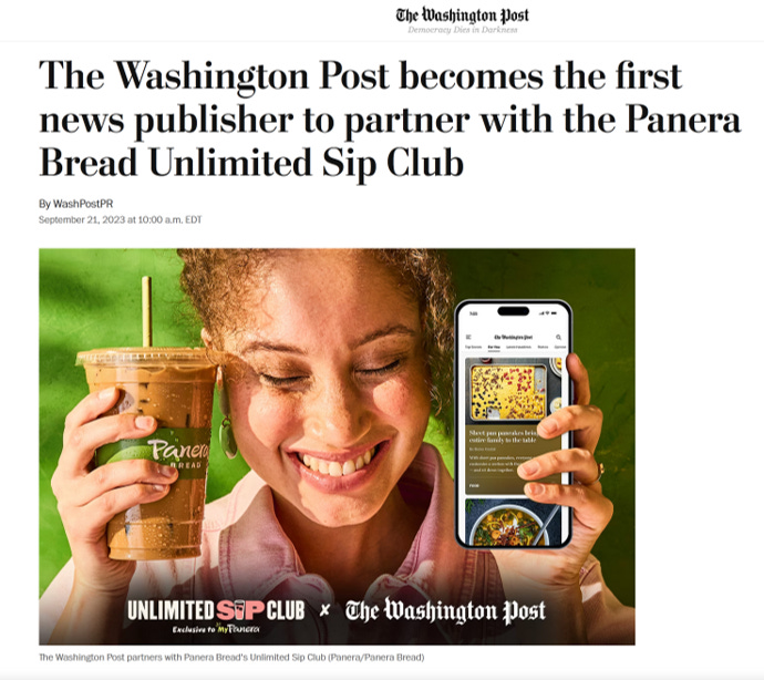 “The Washington Post is delighted to announce today a new partnership with Panera Bread which will provide six months of Washington Post digital access for free for members of Panera’s Unlimited Sip Club. Now, members of the beverage subscription can start their day with not only their favorite drinks, like coffee or a Charged Lemonade, but also news they can use with unlimited digital access to The Post’s world-renowned journalism.”